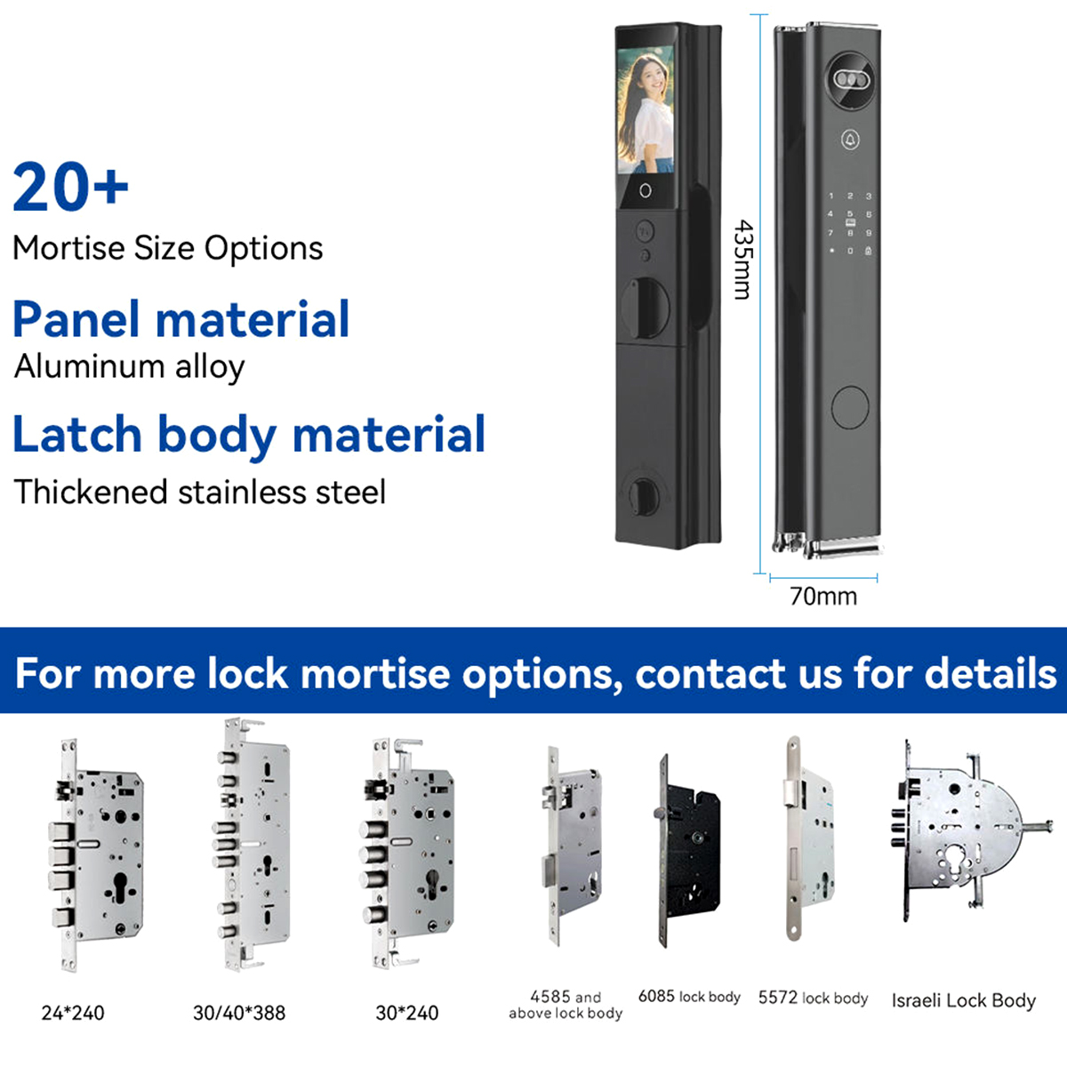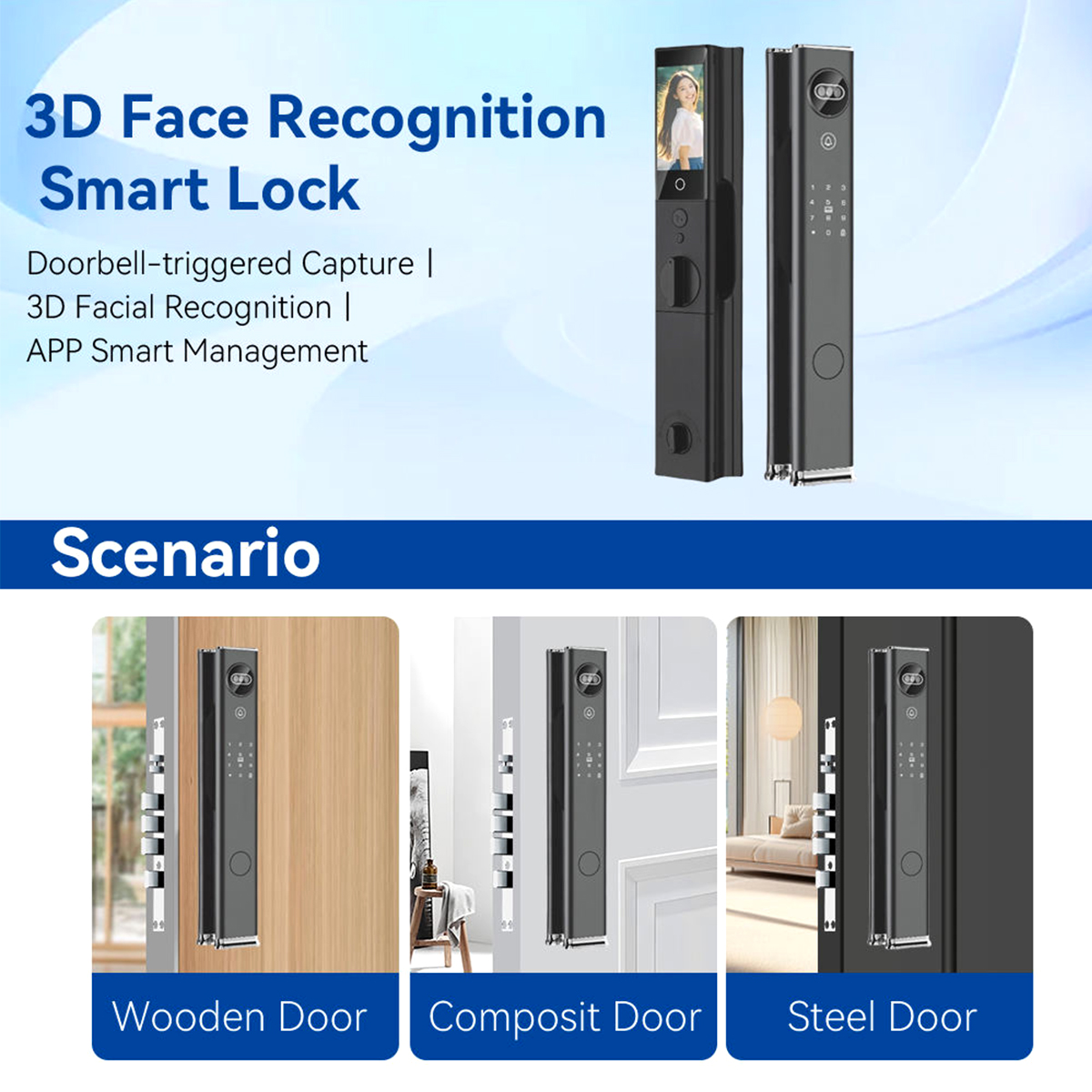 The 3D Facial Recognition Smart Security Door adopts advanced facial recognition technology, supporting multiple unlocking methods for efficient and convenient security. Ideal for homes or offices, it provides comprehensive protection for your entryway.