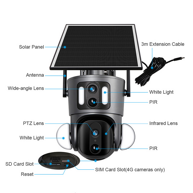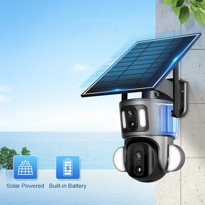 The Solar Dual-Lens PTZ Camera is a high-performance security device that combines intelligent monitoring with eco-friendly, energy-saving design. Equipped with advanced AI human detection technology, full-color night vision, and a solar-powered system, it provides long-lasting, low-maintenance surveillance. Ideal for homes, offices, and outdoor spaces, it delivers reliable and intelligent protection around the clock.