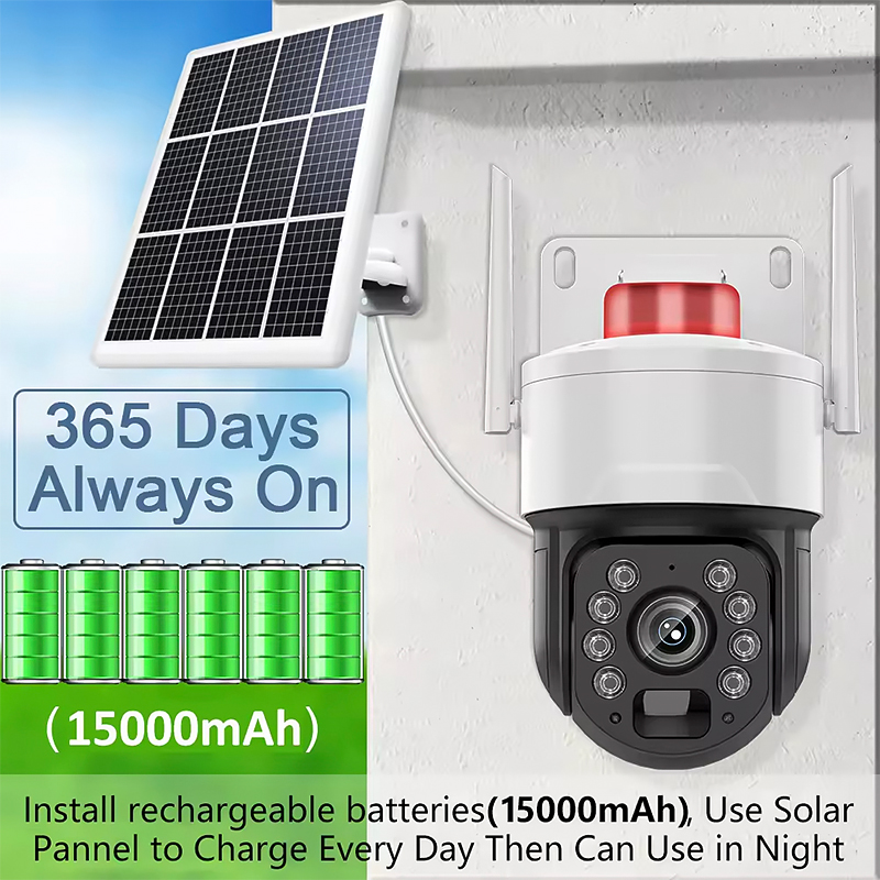 Built-in 15,000mAh high-capacity battery combined with an 8W solar panel provides continuous power, reducing manual maintenance.